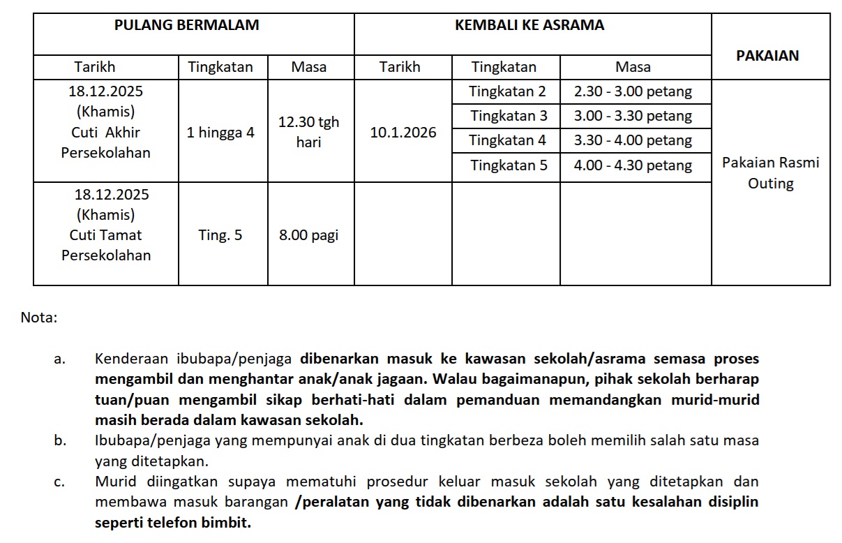 PEMAKLUMAN MURID PULANG BERMALAM CUTI AKHIR PERSEKOLAHAN 2025