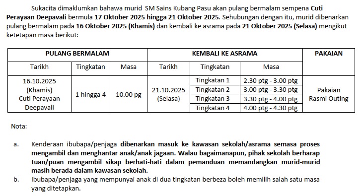 PEMAKLUMAN MURID PULANG BERMALAM SEMPENA CUTI DEEPAVALI 2025 <<< Sila klik untuk MUAT TURUN Surat Pemakluman Pulang Bermalam Cuti Deepavali 2025 >>>