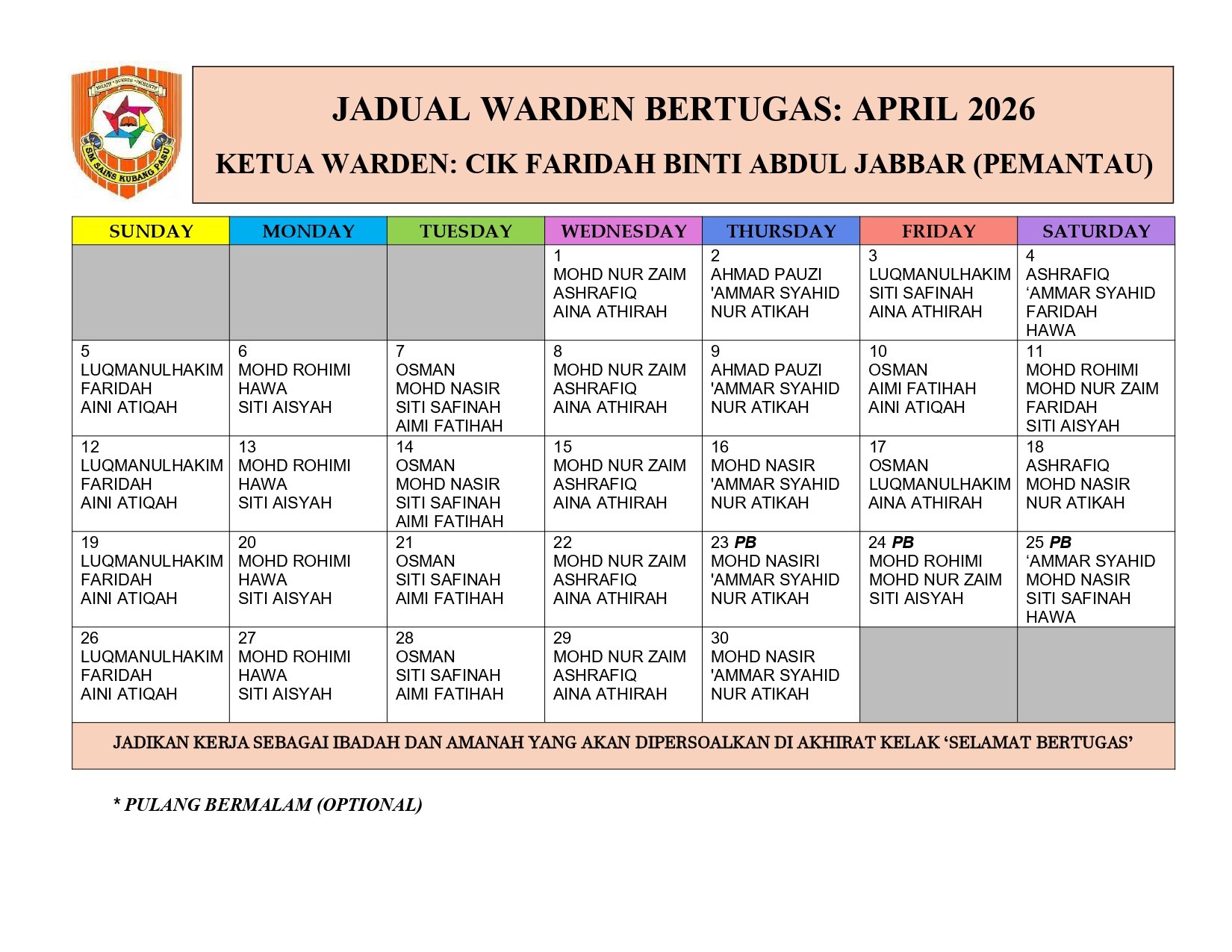 *** JADUAL WARDEN BERTUGAS 2026 ***