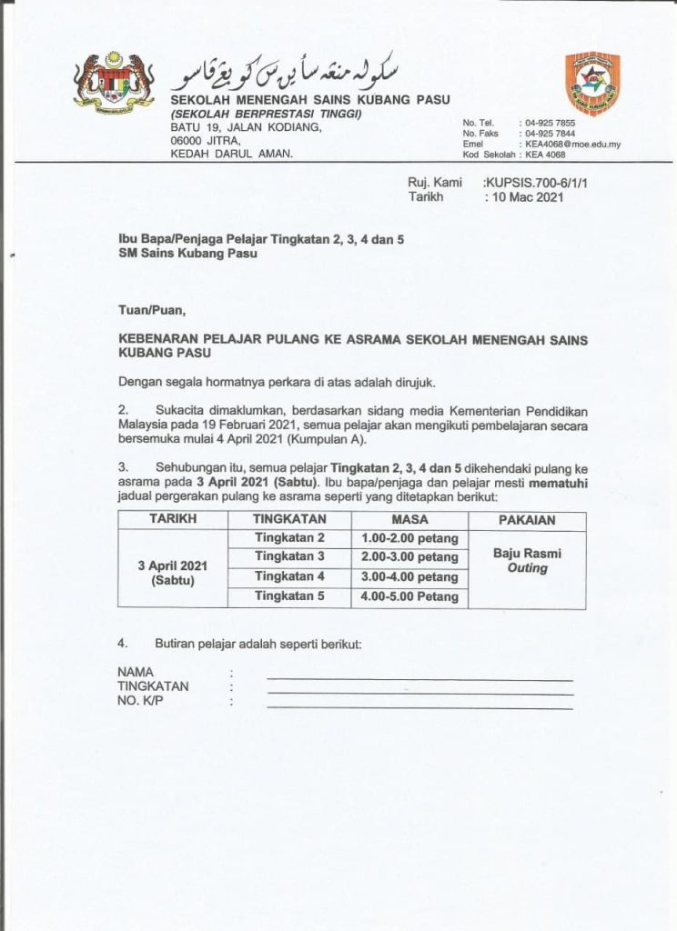 KEBENARAN PULANG KE ASRAMA