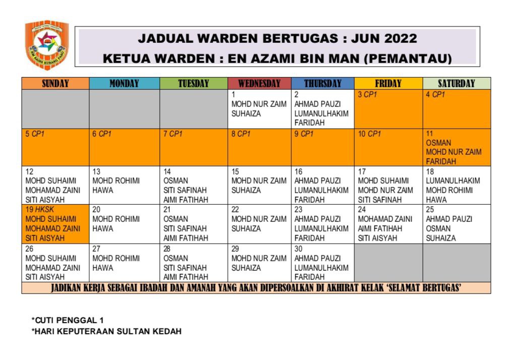 Jadual Warden Bertugas JUN 2022