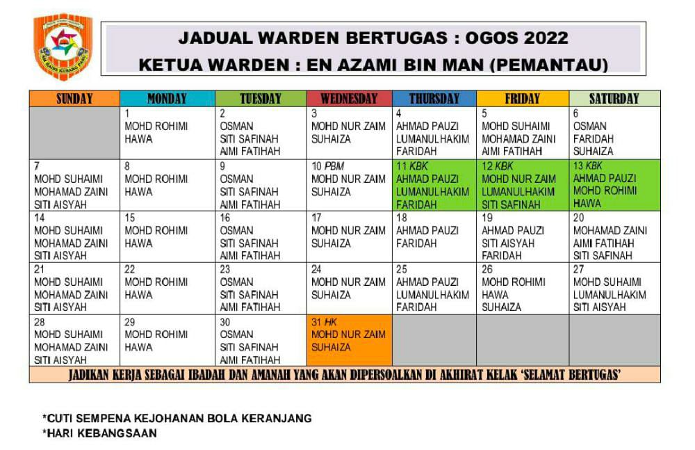 Jadual Warden Bertugas OGOS 2022