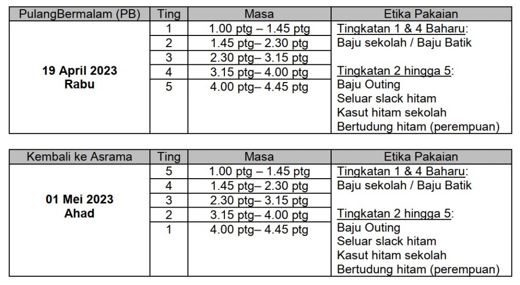 Jadual Pulang Bermalam, Outing & Lawatan Waris 2026